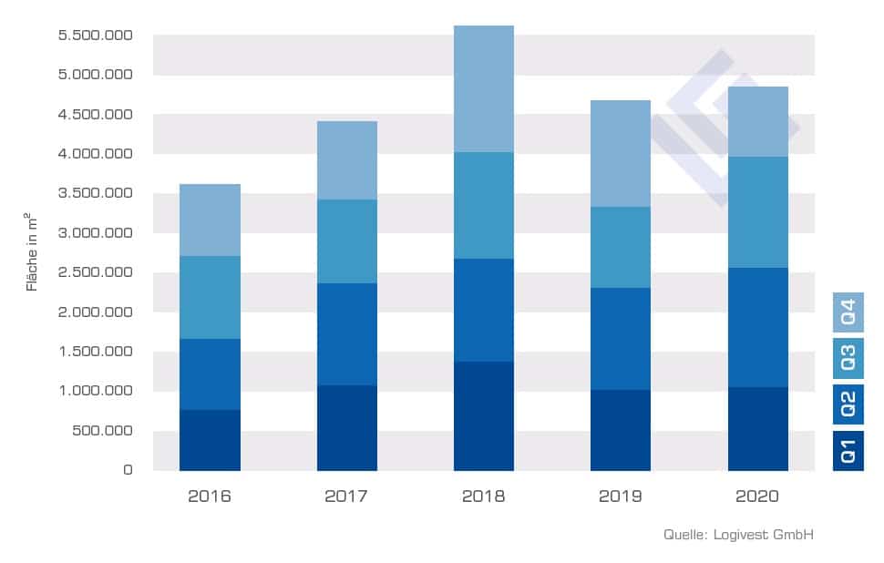 Mit einem Neubauvolumen von rund 4,8 Millionen Quadratmetern wurde das bereits hohe Niveau von 2019 (4,6 Millionen Quadratmeter) um fast 4,5 Prozent überschritten. Logivest misst dabei stets den Zeitpunkt des Baustarts. In den vergangenen fünf Jahren fiel das Volumen lediglich 2018 mit über fünf Millionen Quadratmeter größer aus.