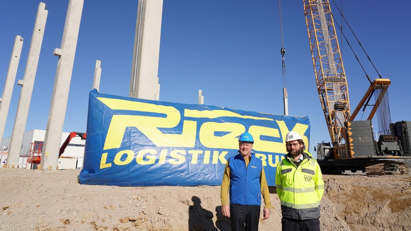 7. März 2022Mit den ersten Betonsäulen startete heute der Terminalneubau der Rieck Logistik-Gruppe im brandenburgischen Oberkrämer. Das Setzen der Säulen begleiteten Detlef Helsing, Geschäftsführer Systemspedition der Rieck Logistik-Gruppe, sowie Julian Frewer, Projektleiter der VGP Industriebau GmbH – die VGP-Gruppe entwickelt den Neubau.