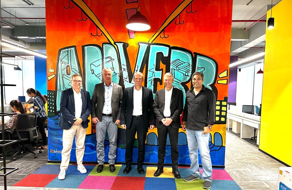 Foto: © Kardex / Bildlegende (v.l.n.r.): Pieter Feenstra – CEO Addverb EMEA, Dr. Volker Jungbluth – Head of Corporate Technology Kardex, Dr. Jens Hardenacke – CEO Kardex, Daniel Hauser – Managing Director Kardex AS Solution, Sangeet Kumar – CEO Addverb